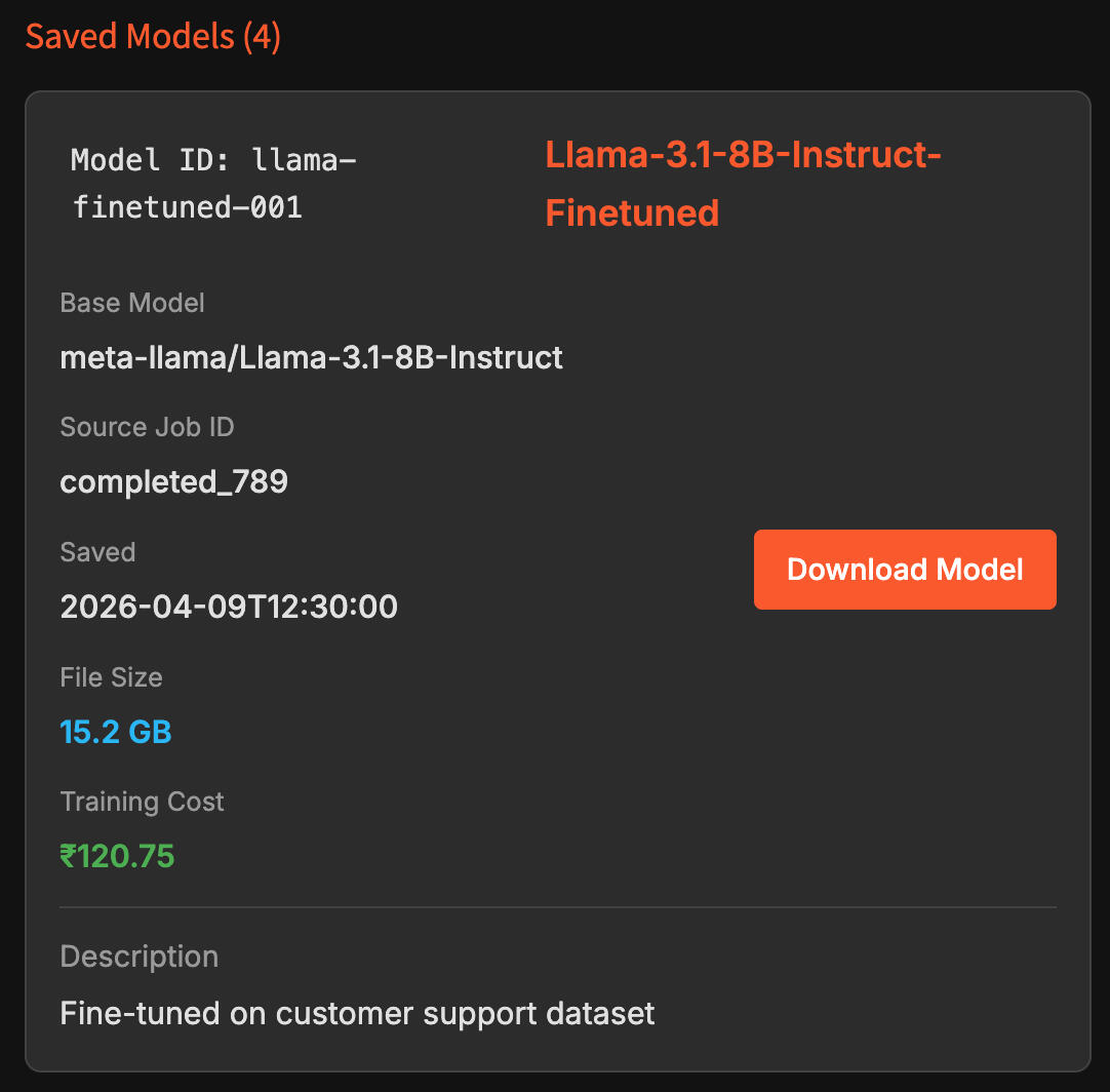 Delivers your fine-tuned model for instant download.